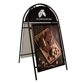 The Pavement Sign Round Tube A-board is versatile for both indoor and outdoor use featuring a unique design that catches the eye. Personalization options include customizing the round header with a name, logo, or slogan. The sign is portable and easy to store. Thanks to the waterproof click profile ensuring poster protection and effortless poster replacement. This A-board offers functionality and aesthetic appeal for effective advertising. It is a practical and customizable solution for displaying information or promotions.